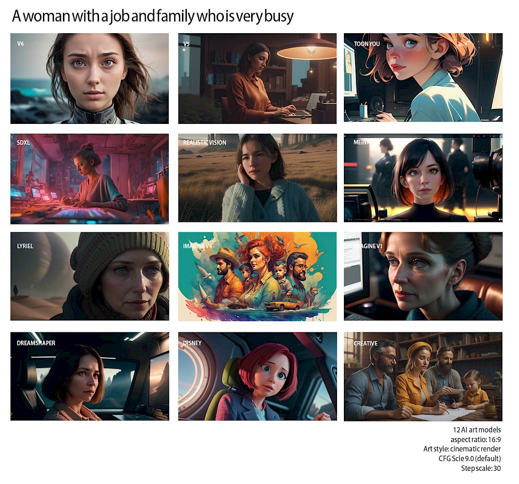 Imagine.art offers at least 36 AI art models, and within each model 90 styles. I ran the following prompt through all 36 models: "a woman with a job and family who is very busy." What I discovered, surprised me...