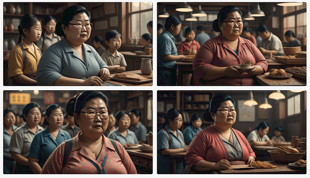 Okay, I tried "An Asian, Nonbinary, mid-50s, pudgy, woman with a job and family who is very busy" and got this... which is wrong on so many levels, I won't bother to unpack. But yes, please do remember to include food in any photo where I indicate weight...