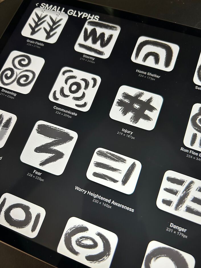 In order to tell the bear's story in Wander, I needed to create a bear language. I researched Native American and Runic symbols, Mayan and Egyptian hieroglyphics, the Maori alphabet, Cree and Inuktitut syllabics, as well as hobo symbols, icons and emojis, and ultimately crafted a set of guidelines for creating my bear glossary: