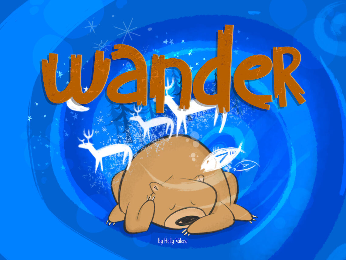Wander begins with a dreaming bear waking from hibernation, and meanders along across the seasons, exploring the environment, encountering wildlife and sharing new experiences before returning to hibernation at the end of the year. This story is told from the bear’s perspective – imagined via rich bearish glyphs representing the bear’s language. A full glossary of pictographs serves as a reference to check your understanding.