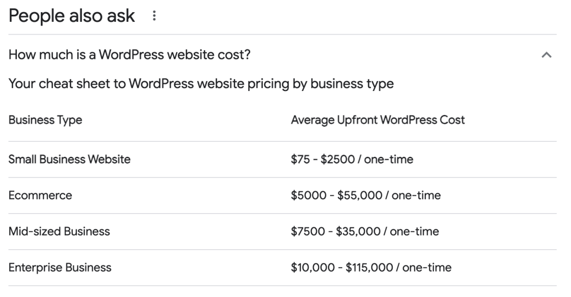| ANY WEBSITE | $12,000 - $150,000 + | $25/domain, $180-$3,600/hosting ($15-300 month) | $400-$60,000 year to maintain a website | Via WebFX |