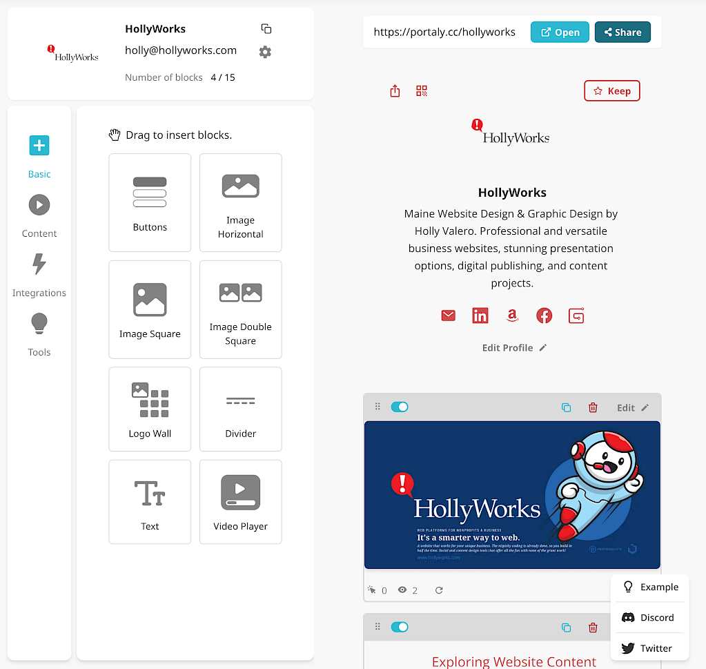 This is where Portaly.cc comes in. I added my URL and email and – in less than a minute – I had a basic page – curated by AI. And I was happy with the result. It came with my customized link of choice, so easy to use and remember.