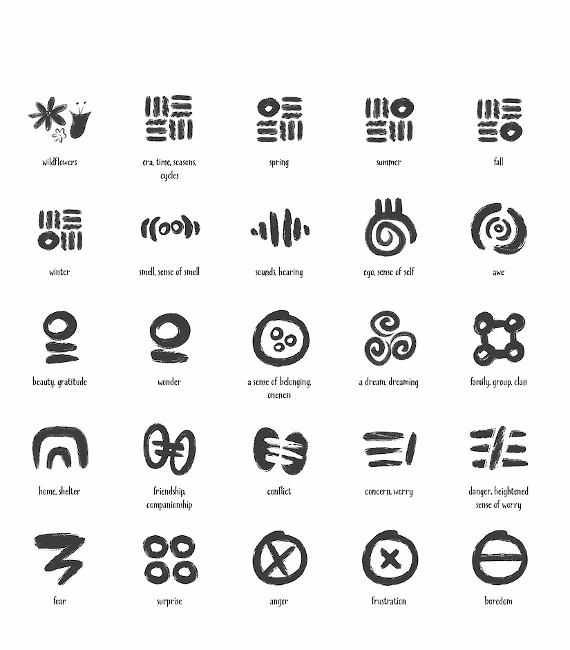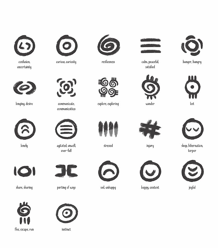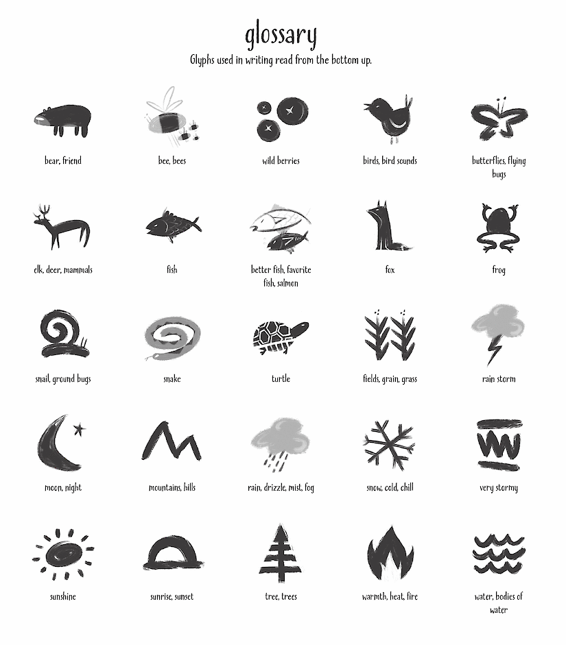 In order to tell the bear's story in Wander, I needed to create a bear language. I researched Native American and Runic symbols, Mayan and Egyptian hieroglyphics, the Maori alphabet, Cree and Inuktitut syllabics, as well as hobo symbols, icons and emojis, and ultimately crafted a set of guidelines for creating my bear glossary: