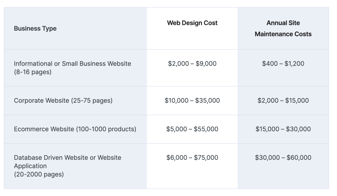 | ANY WEBSITE | $12,000 - $150,000 + | $25/domain, $180-$3,600/hosting ($15-300 month) | $400-$60,000 year to maintain a website | Via WebFX |